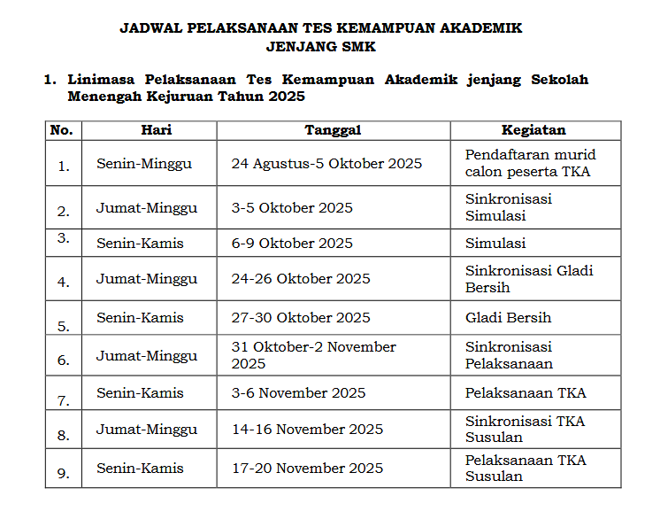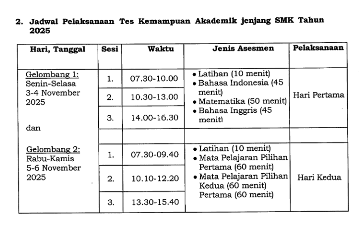 Jadwal Tes Kemampuan Akademik (TKA) SMK TIARA Gembong Tahun 2025